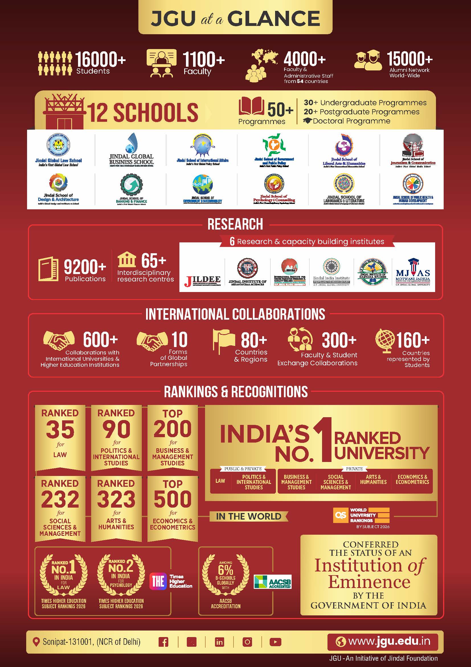 The Jindal Global Law School, has retained its number one rank in India for six consecutive years and remains the only Indian law school listed in the Global Top 100 by the QS World University Rankings by Subject 2025. Furthermore, JGU holds the distinction of being India’s top private university for Arts & Humanities and Politics & International Studies (within the Top 201-250 globally). It ranks among the top two private universities in India for Economics & Econometrics, among the top three private universities in India (Top 274 in the world) for Social Sciences & Management, and among the top six private universities in India for Business & Management Studies (Top 500 in the world) as per the QS World University Rankings by Subject 2025. In 2020, JGU was recognised as an ‘Institution of Eminence’ by the Ministry of Education, Government of India.