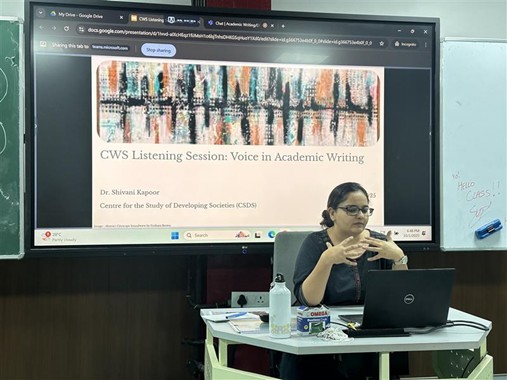 On October 1, it held a session titled Voice in Academic Writing as part of the CWS Listening Session Series curated by Prof Shubhasree Bhattacharyya. The session featured Dr. Shivani Kapoor from the Centre for the Study of Developing Societies (CSDS), Delhi, as a guest speaker. The CWS Listening Sessions focus on artistic and academic research practices alongside the idea of the text as an intermedial and interdisciplinary site of listening and understanding.