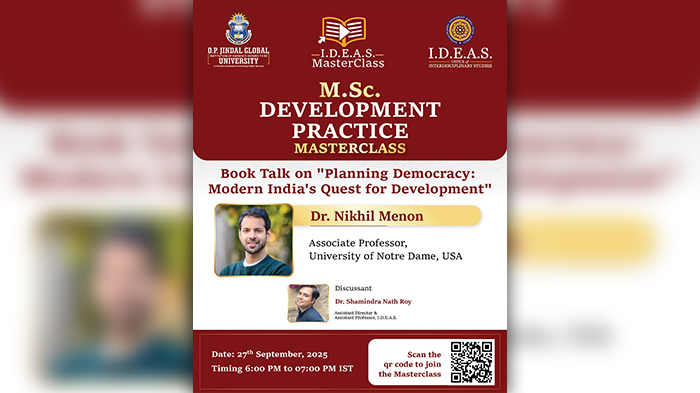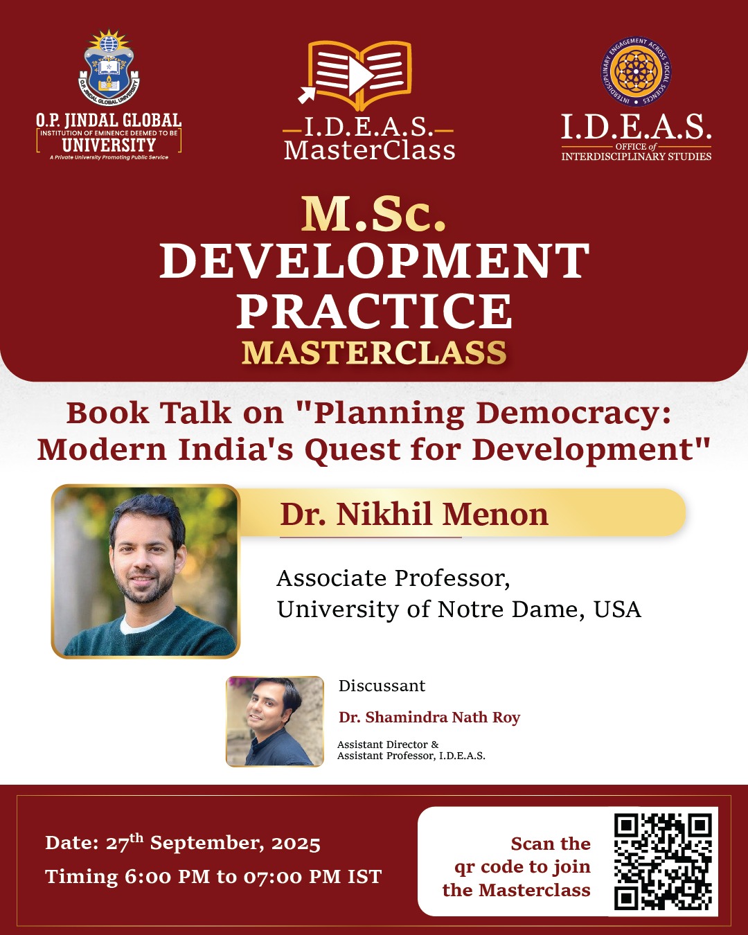 I.D.E.A.S. Masterclass M.Sc. Development Practice Masterclass Book Talk on, "Planning Democracy: Modern India's Quest for Development" by Dr. Nikhil Menon, Associate Professor, University of Notre Dame, USA.