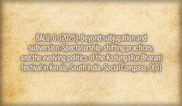 BALU, G. (2025). Beyond subjugation and subversion: Spectatorship, shifting practices, and the evolving politics of the Kodungallur Bharani festival in Kerala, South India. Social Compass, 0(0).