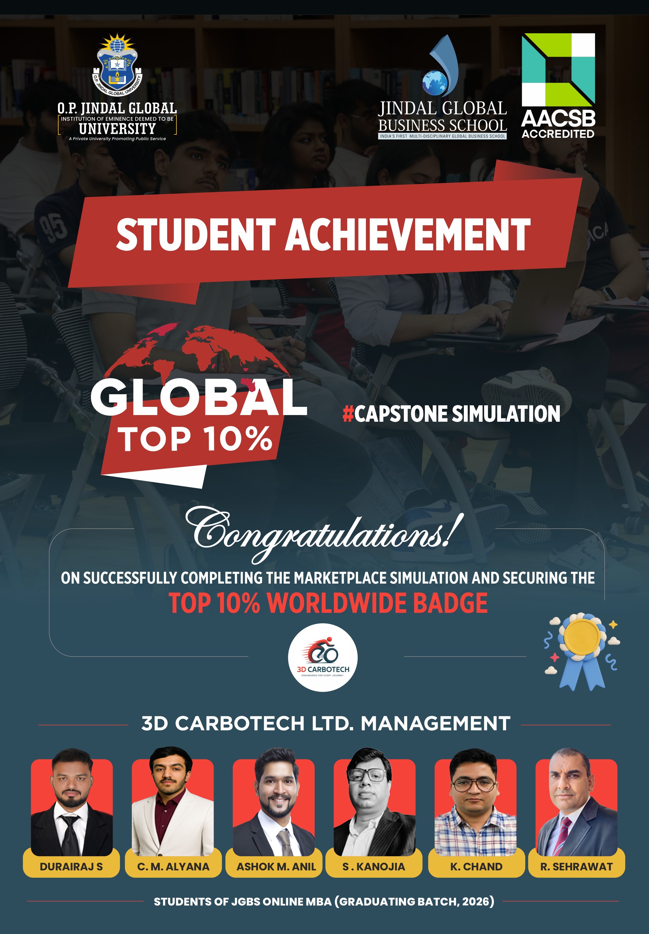 The 3D Carbotech Management Team—Durairaj S, C. M. Alyana, Ashok M. Anil, S. Kanojia, K Chand, and R. Sehrawat (Online MBA, Class of 2026)—secured the Global Top 10% Worldwide Badge in the Capstone Marketplace Simulation.