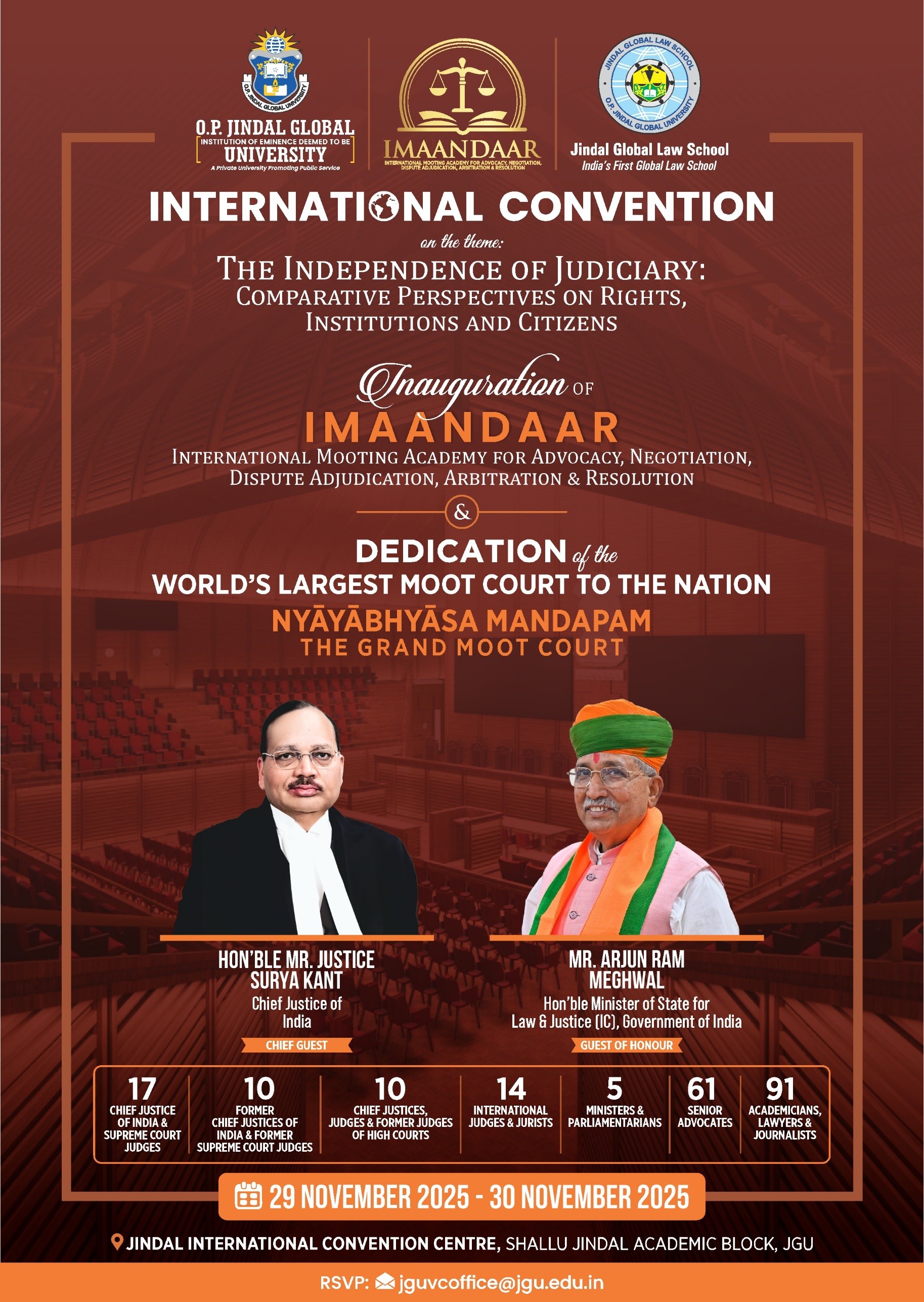 To mark the inauguration of the world's largest moot court, Nyayabhyasa Mandapam, and the International Mooting Academy for Advocacy, Negotiation, Dispute Adjudication, Arbitration & Resolution (IMAANDAAR), JGU organised on its campus a two-day 'International Convention on Independence of Judiciary: Comparative Perspectives on Rights, Institutions and Citizens' on November 29 and 30.