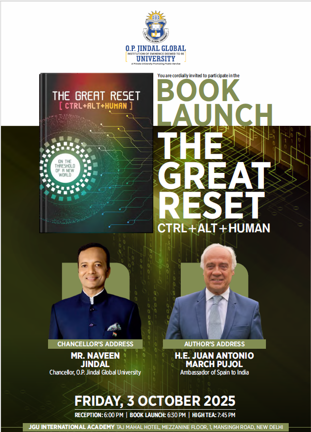 JGU organised on October 3 the book launch of ‘The Great Reset: CTRL+ALT+HUMAN’ authored by H.E. Juan Antonio March Pujol, Ambassador of Spain to India.