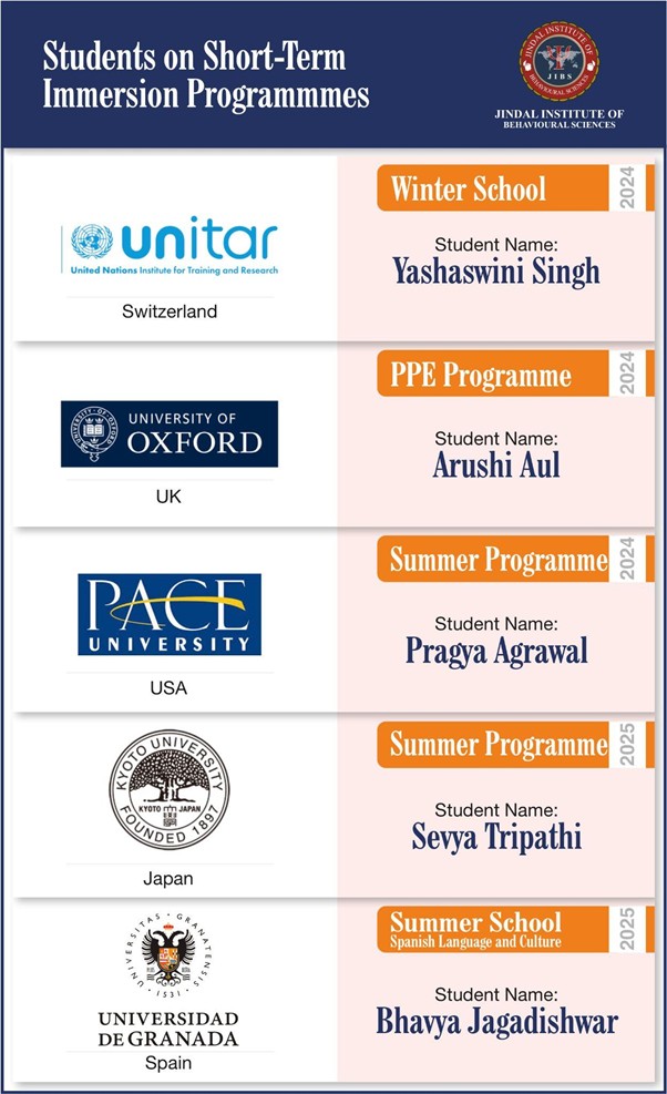 The International Collaborations (IC) office at Jindal Institute of Behavioural Sciences (JIBS) works in close partnership with the Office of International Affairs and Global Initiatives (IAGI) at O.P. Jindal Global University (JGU) to provide a diverse array of study abroad opportunities for our Master’s students.