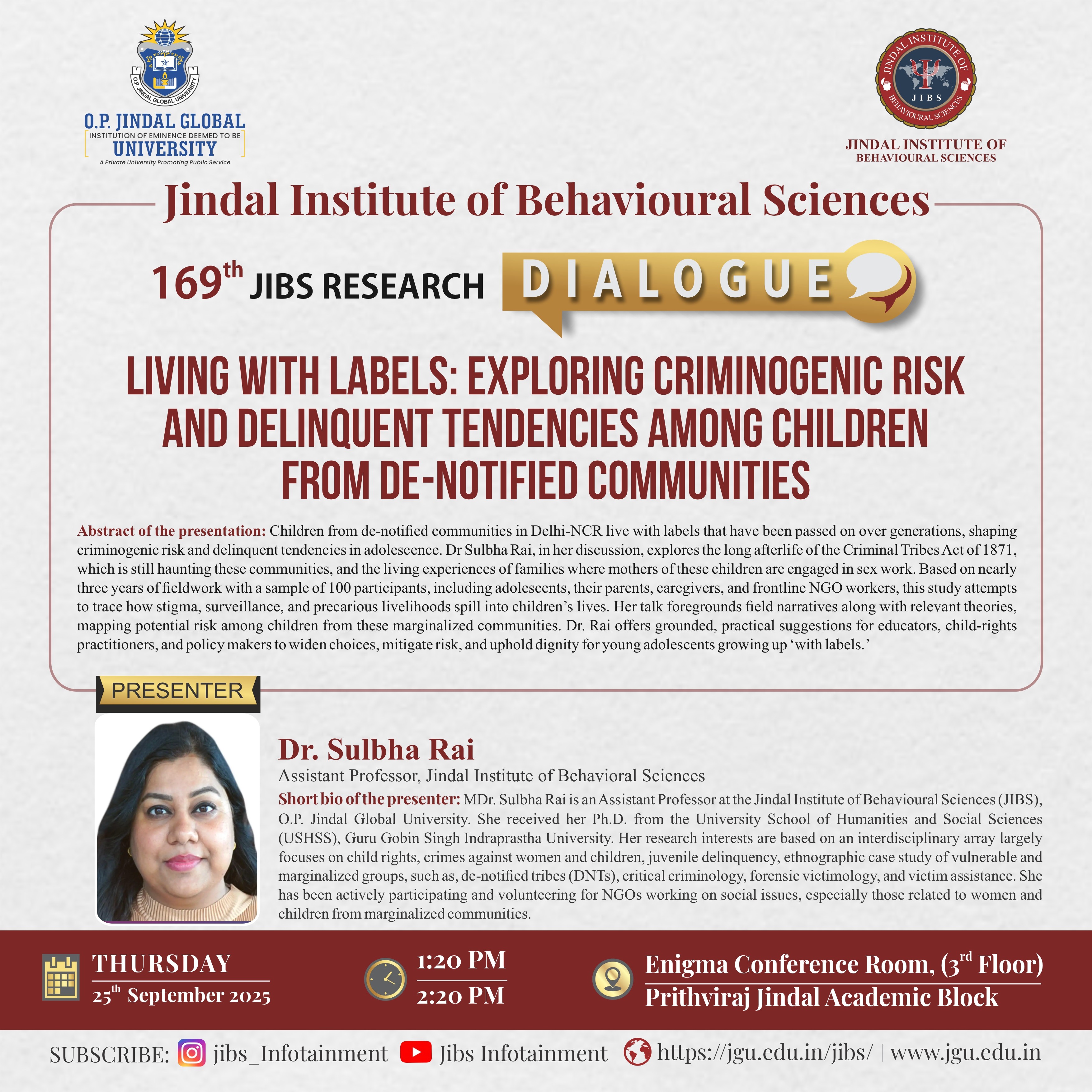169th JIBS Research Dialogue organized by the Jindal Institute of Behavioural Sciences (JIBS). Dr. Sulbha Rai, Assistant Professor, JIBS, presented her study titled 'Living with labels: Exploring criminogenic risk and delinquent tendencies among children from de-notified communities.'