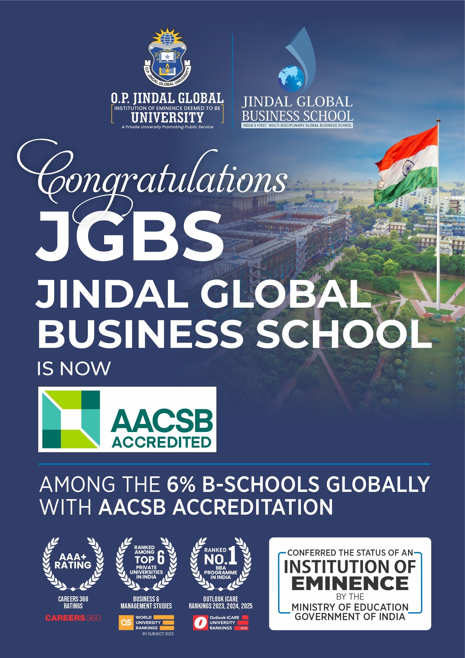 Jindal Global Business School (JGBS) of O.P. Jindal Global University (JGU), has been awarded the prestigious AACSB International (Association to Advance Collegiate Schools of Business) Accreditation, one of the highest standards of excellence for business schools worldwide. This distinction places JGBS among the top business schools in the world and among a very small, select group of institutions in India that have achieved this honour.