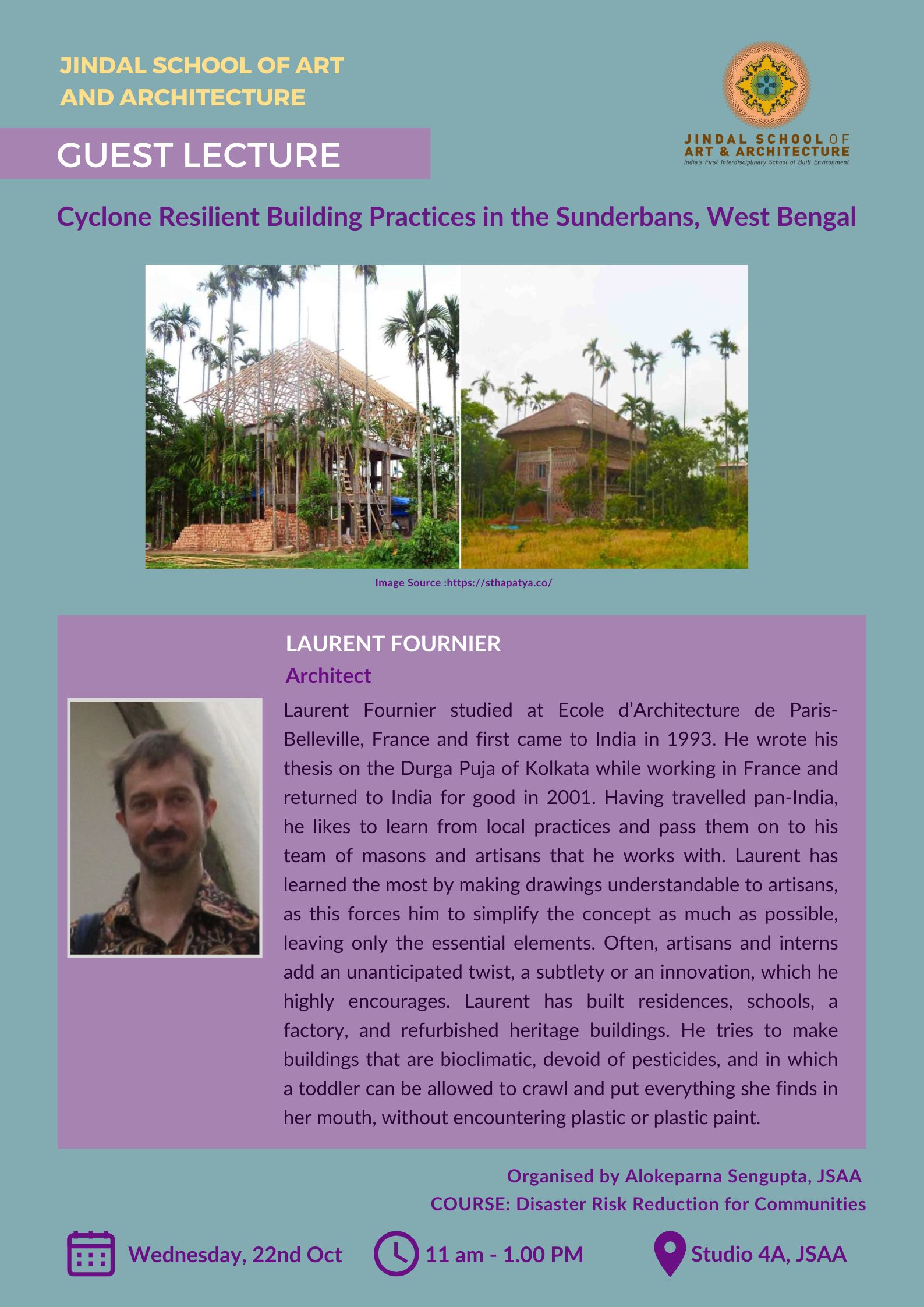Laurent Fournier, a practicing architect, gave a lecture titled “Cyclone Resilient Building Practices in the Sunderbans, West Bengal”. This talk has been organized as part of the course Disaster Risk Reduction for Communities.