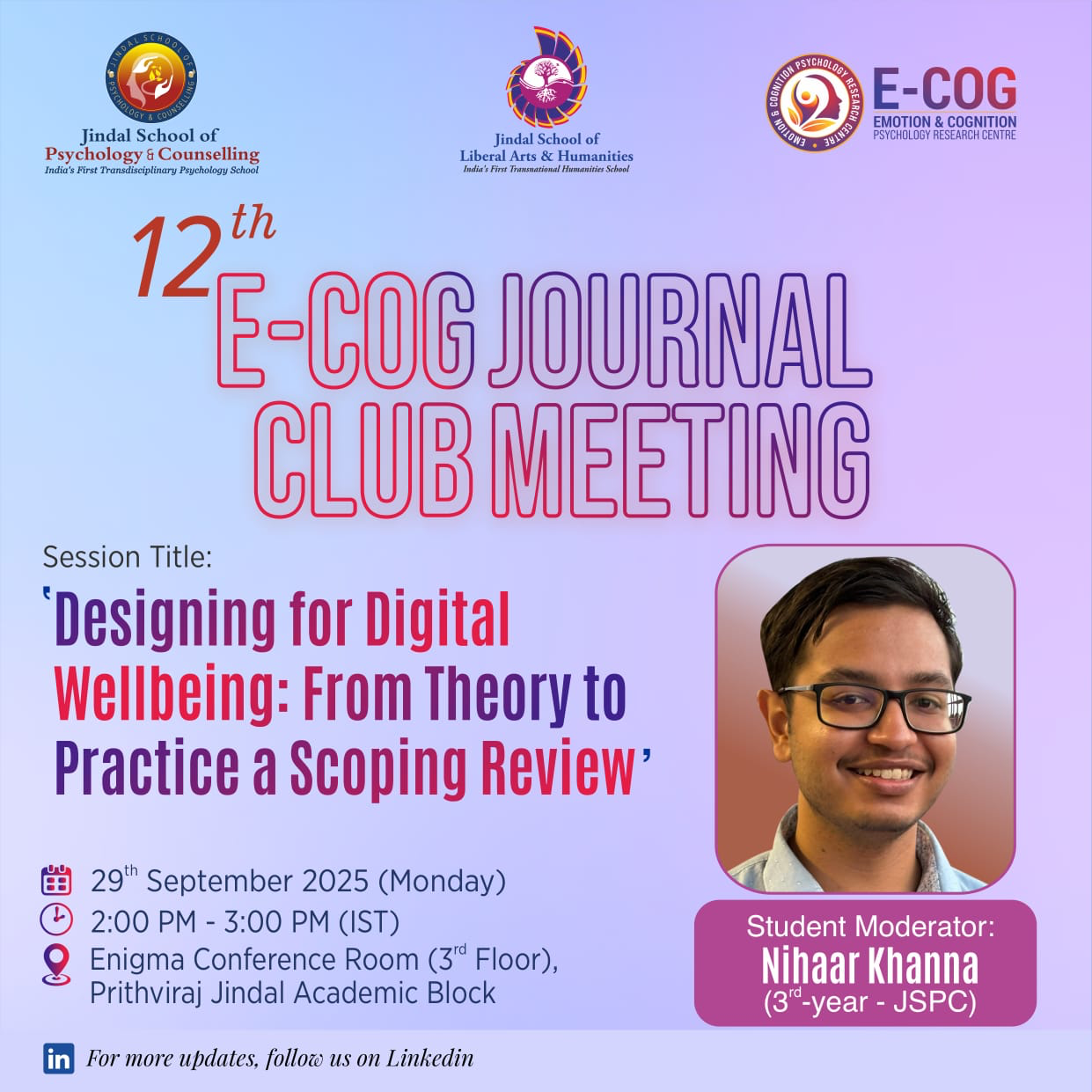 12th Journal Club Meeting of E-Cog, the Emotion and Cognition Research Centre at JSPC. In this session, Nihaar Khanna, 3rd-year student at the Jindal School of Psychology and Counselling presented the important arguments in the journal paper “Designing for Digital Wellbeing: From Theory to Practice a Scoping Review” by Reem S. Al-Mansoori et. al (2023) and then moderate the discussion on the same.