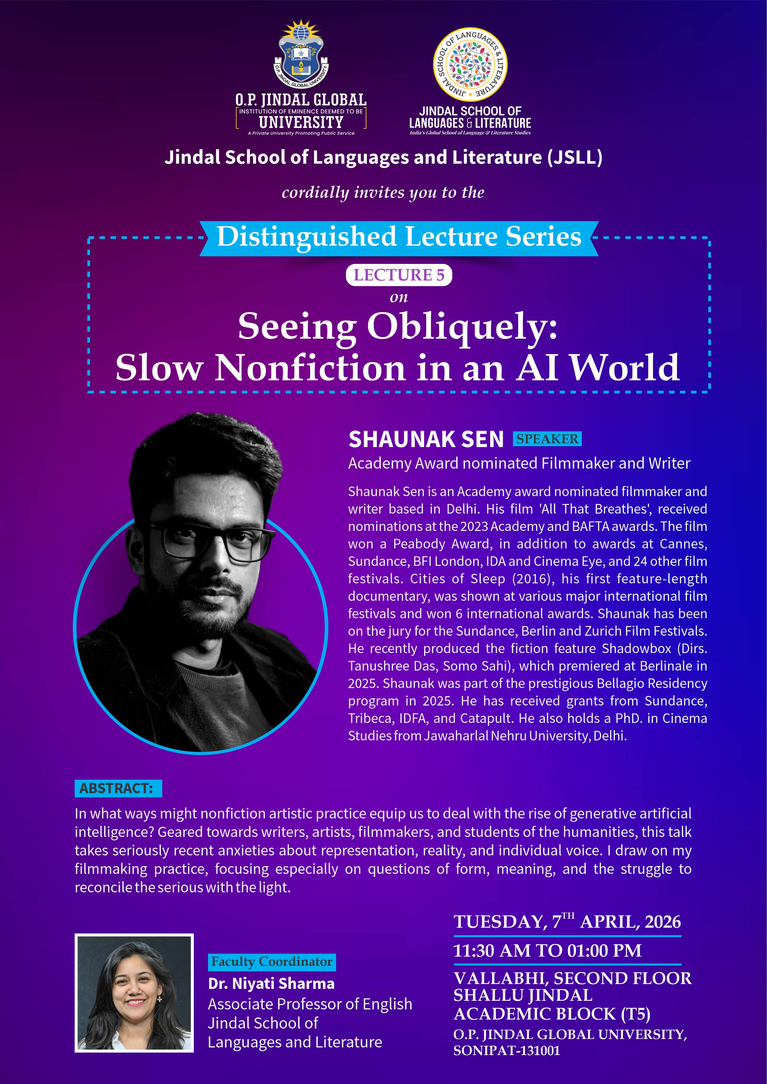 The Jindal School of Languages and Literature organized a talk on 7th April by the Academy Award nominated filmmaker Shaunak Sen titled: 'Seeing Obliquely: Slow Nonfiction in an AI World'