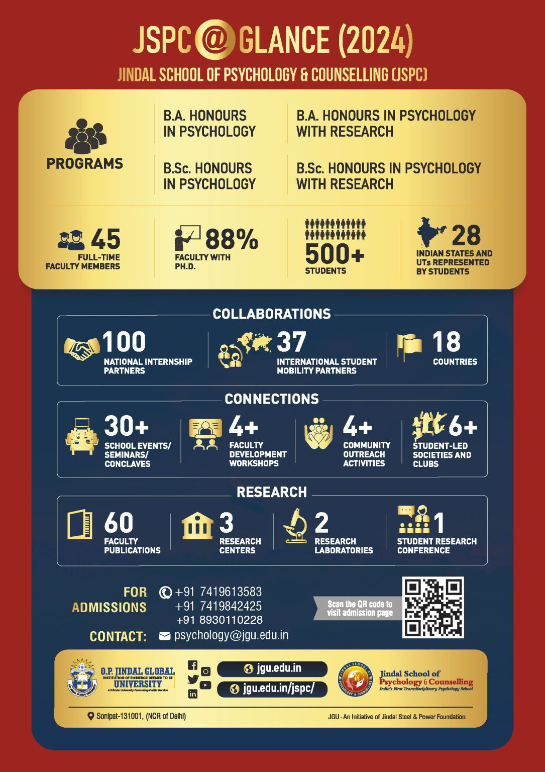 Jindal School of Psychology & Counselling (JSPC) aims to be recognised as a preeminent national and international leader in psychological education by maintaining the highest academic standards. Students gain expertise in psychological theory, experimentation, and practice in a rich and vibrant intellectual environment, led by a diverse group of research-active faculty scholars. Over four years, students learn the value of critical and creative thinking, coupled with instruction in the diverse sub-disciplines of psychology, including the best mental health assessment and treatment procedures. Students gain real-world experience through practicums and assorted internship opportunities, while the school’s collaborations with eminent universities around the world provide ample opportunity to study abroad. Beyond psychology, interdisciplinary learning is assured via hundreds of innovative elective courses offered by the 11 other schools of JGU. JSPC strives to provide the requisite knowledge, skills, and opportunities for students to stretch themselves personally and academically, promoting an enriching college experience.
