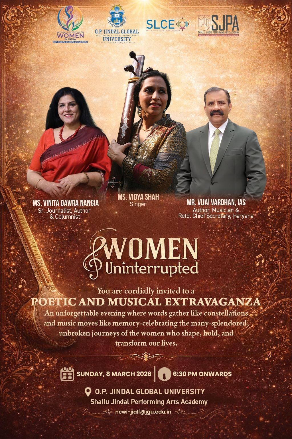 Special cultural evening titled “Women Uninterrupted – A Poetic and Musical Extravaganza,” being organised as part of the Second National Convention on Women in India and the Inaugural Jindal Interdisciplinary Arts & Literature Festival. This evocative evening will bring together poetry, music, and reflection to celebrate the many journeys of women who inspire, shape, and transform our lives. The programme will feature distinguished voices including Ms. Vinita Dawra Nangia, Senior Journalist, Author and Columnist; Ms. Vidya Shah, renowned singer; and Mr. Vijay Vardhan, IAS (Retd.), author, musician, and former Chief Secretary of Haryana.