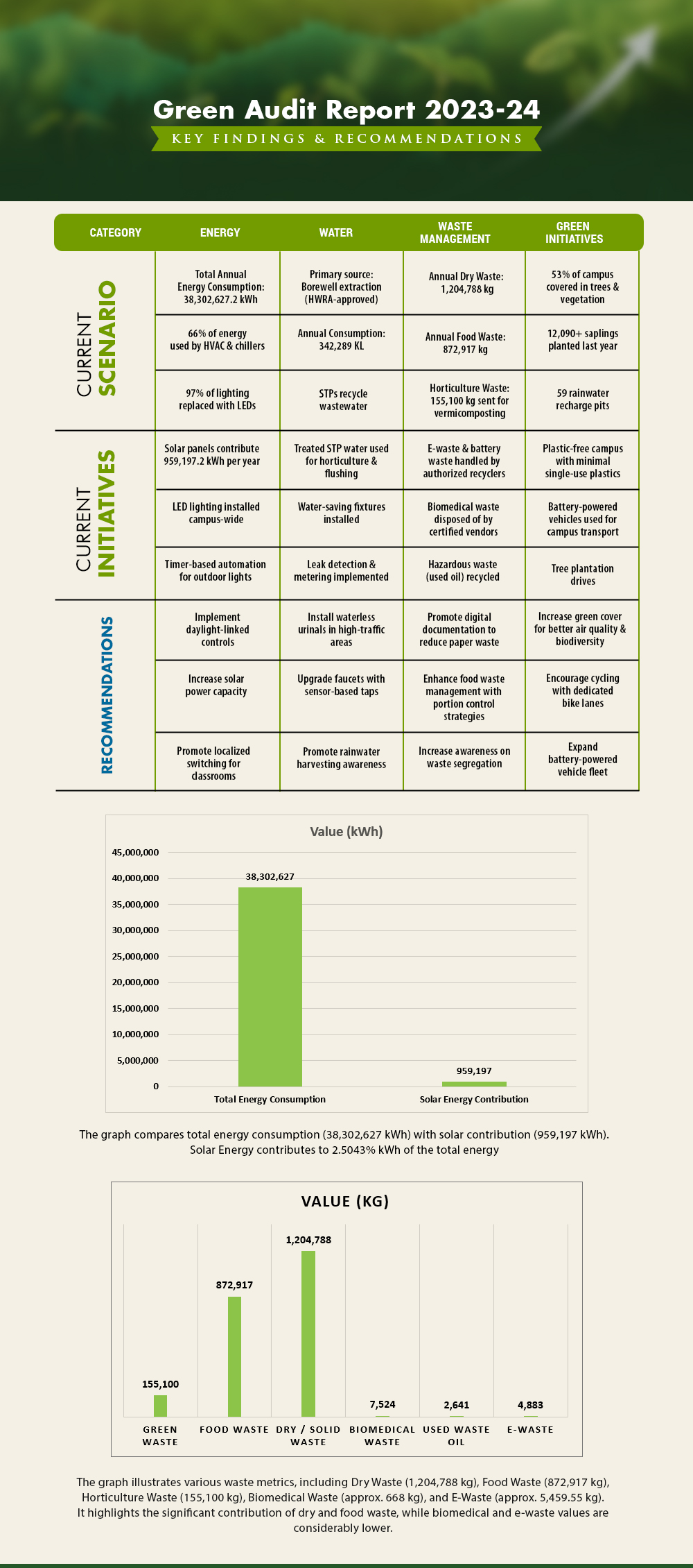 Apart from the above, JGU also participates in regular Green Audits. The Green Audit Report 2023–24 highlights O.P. Jindal Global University’s commitment to sustainability through measurable progress in energy, water, waste management, and green initiatives. Water conservation measures include treated wastewater reuse and leak detection, while waste management practices focus on recycling, composting, and responsible disposal. With over 12,000 saplings planted and 59 recharge pits established, the university continues to enhance its green cover and promote a plastic-free, eco-conscious campus.