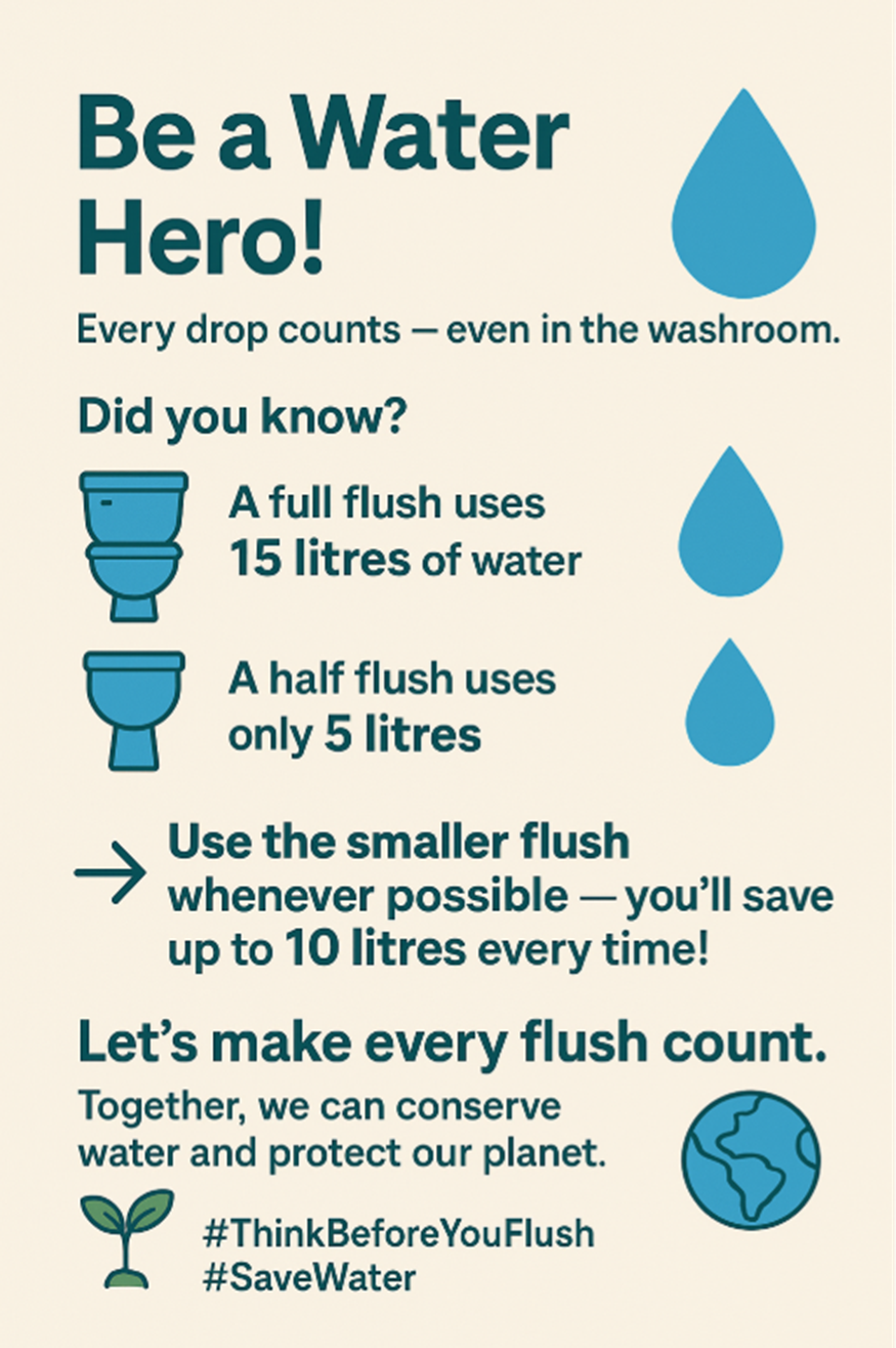 By simply choosing the smaller flush, every user can save up to 10 litres each time. These posters are placed in all accessible washrooms, helping build lasting habits of water conservation through constant visual engagement.