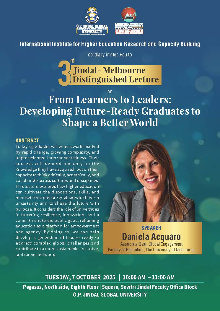 The message of water consciousness also flows through JGU’s academic and global engagement initiatives. For instance, the 3rd Jindal-Melbourne Distinguished Lecture, held on 7th October 2025, focused on “From Learners to Leaders: Developing Future-Ready Graduates to Shape a Better World”, delivered by Dr. Daniela Acquaro, Associate Dean (Global Engagement), Faculty of Education, The University of Melbourne.