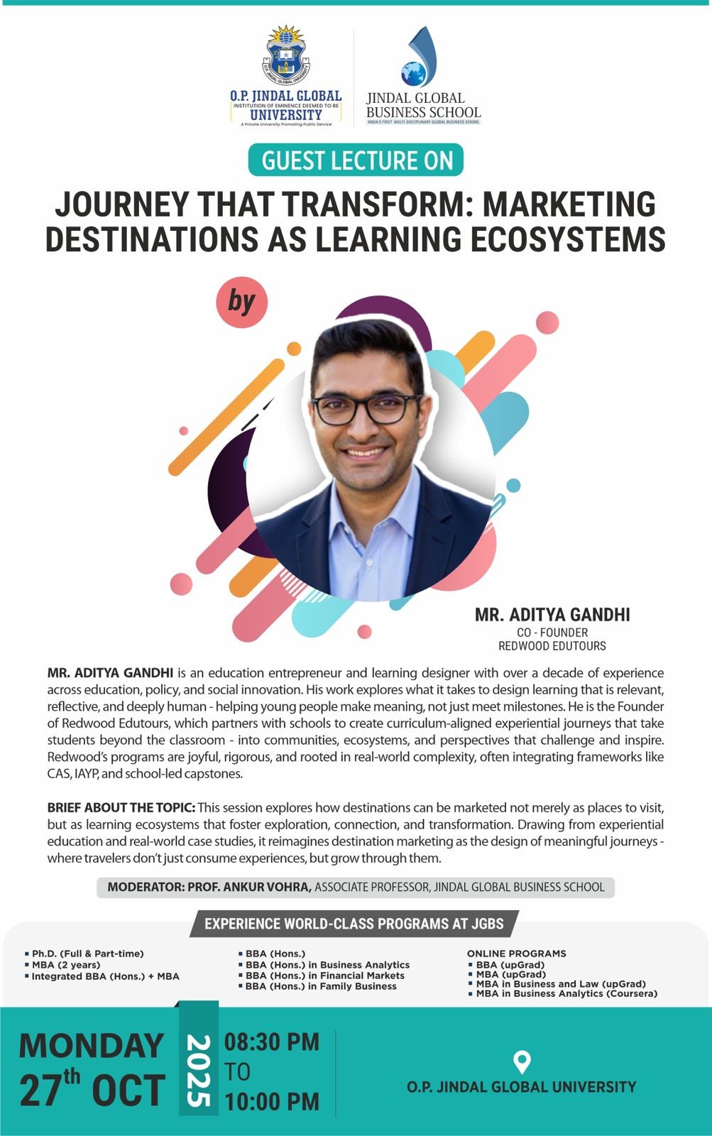 Guest lecture titled- “Journey That Transform: Marketing Destinations as Learning Ecosystems” by Mr. Aditya Gandhi (IIT Mumbai), Co-Founder, Redwood Edutours, as part of our learning for my course Destination Marketing”. This session explores how destinations can be marketed not merely as places to visit, but as learning ecosystems that foster exploration, reflection, and transformation. Drawing from experiential education and real-world case studies, the discussion reimagines destination marketing as the design of meaningful journeys—where travellers don’t just consume experiences, but grow through them.