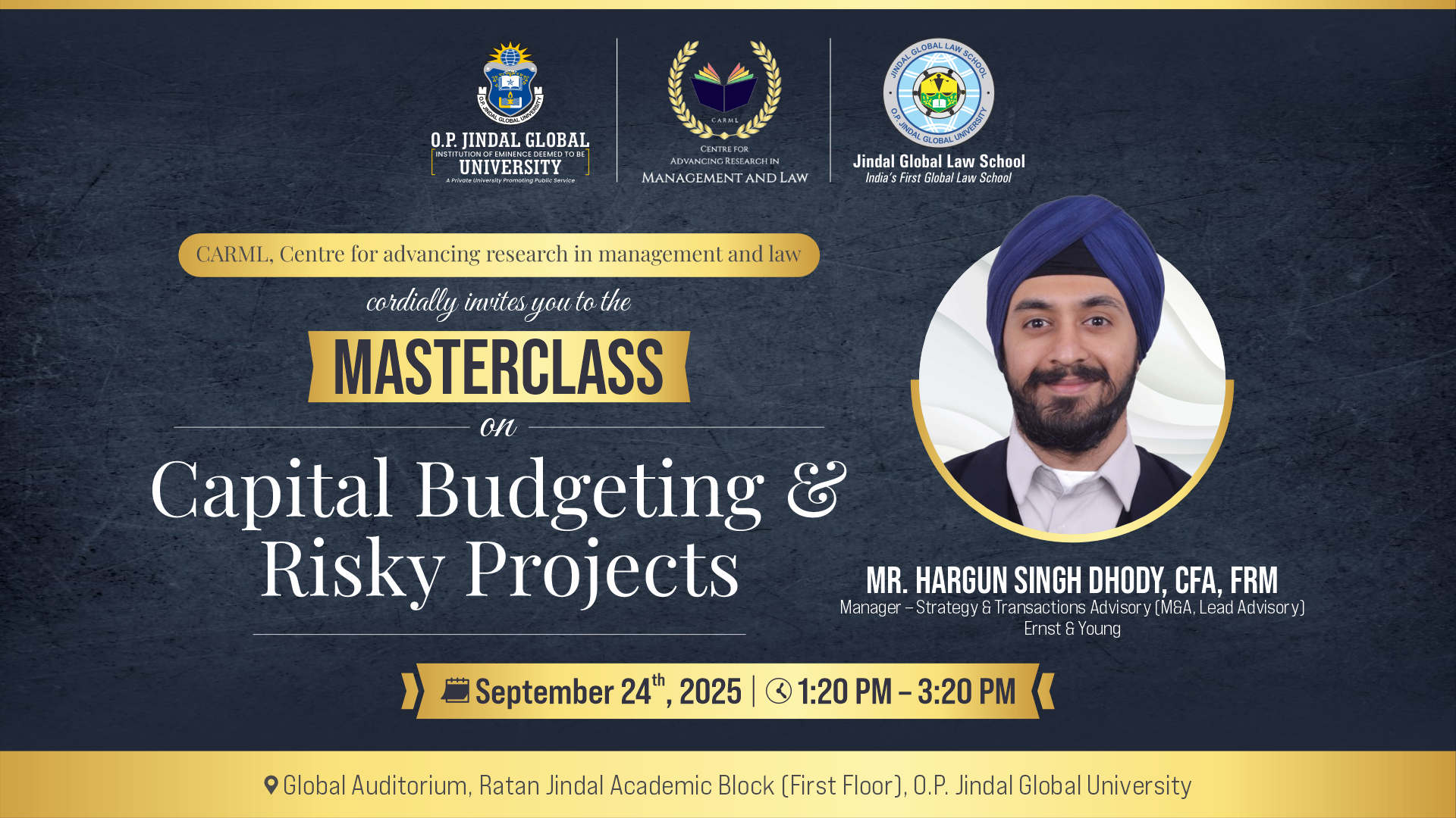 Centre for Advanced Research in Management and Law (CARML), masterclass on “Capital Budgeting & Risky Projects” by Mr Hargun Singh Dhody, CFA, FRM (Manager – Strategy & Transactions Advisory, Ernst & Young). This masterclass will provide practical insights into capital budgeting decisions, evaluating risky projects, and real-world applications from industry practice.