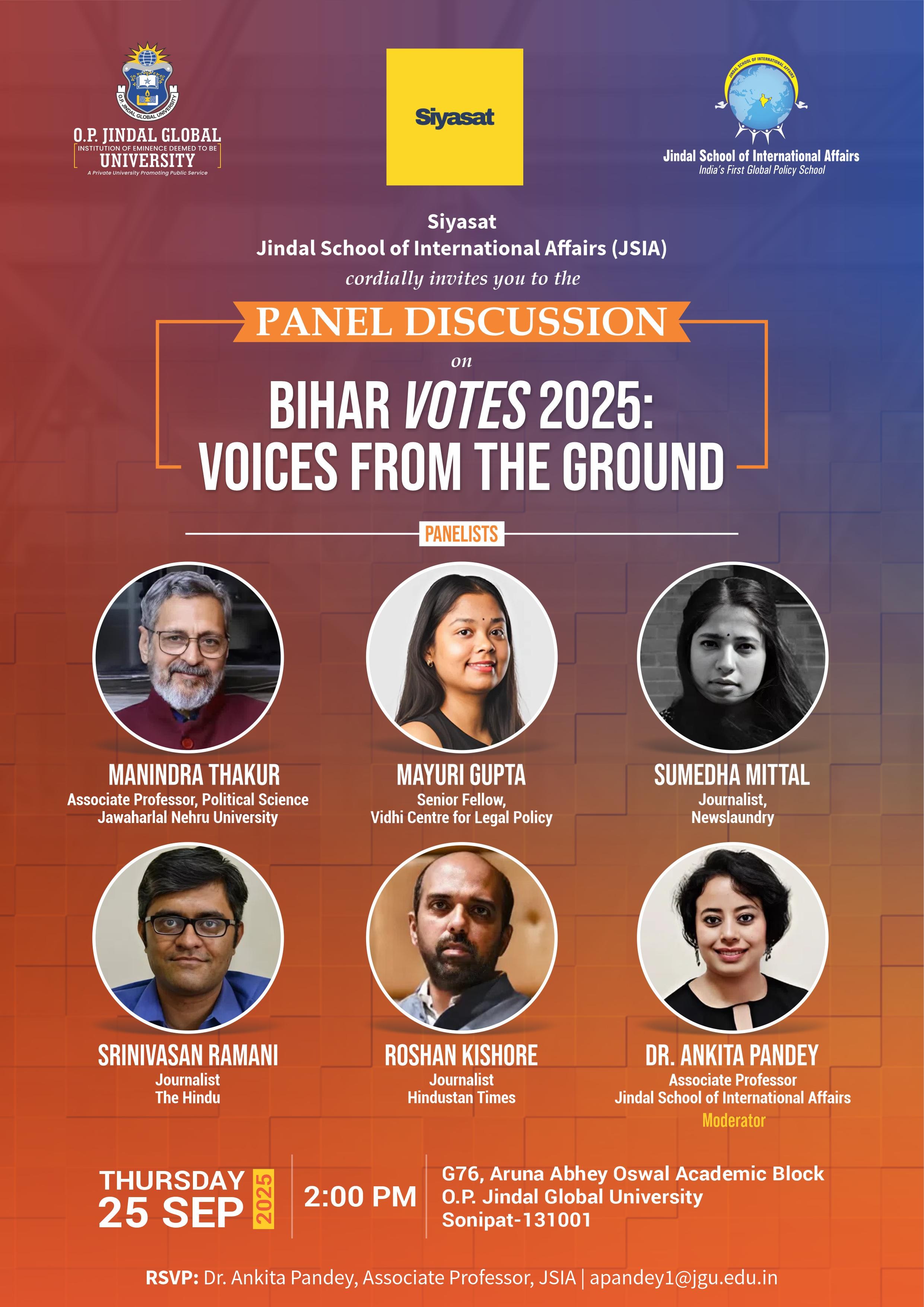 ‘Siyasat’ society of JSIA organised panel discussion on ‘Bihar Votes 2025: Voices from the Ground’. List of panelists- Prof Manindra Thakur, Associate Professor, Political Science, Jawaharlal Nehru University; Ms. Mayuri Gupta; Senior Fellow, Vidhi Centre for Legal Policy; Ms. Sumedha Mittal, Journalist, Newslaundry; Srinivasan Ramani, Journalist, The Hindu; Roshan Kishore, Journalist, Hindustan Times; Dr. Ankita Pandey, Associate Professor, Jindal School of International Affairs.