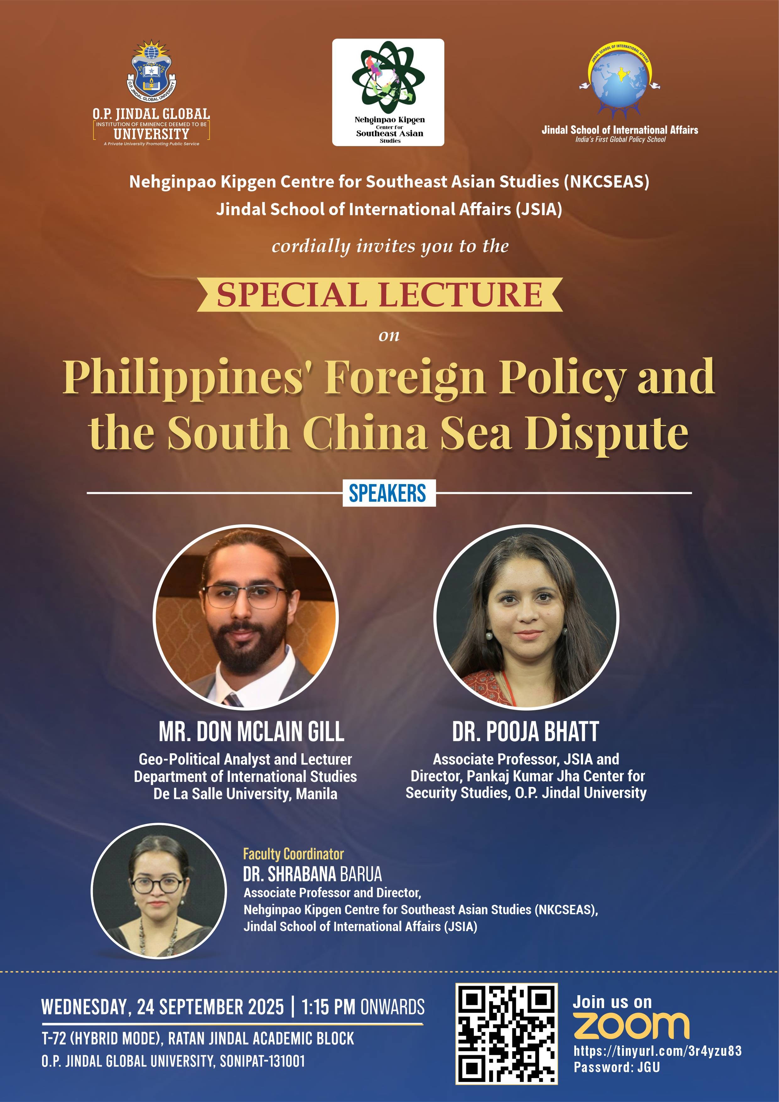 The Nehginpao Kipgen Center for Southeast Asian Studies (NKCSEAS), Jindal School of International Affairs (JSIA), organized a special Lecture on “Philippines' Foreign Policy and the South China Sea Dispute” by Mr. Don Mclain Gill, Geo-Political Analyst and Lecturer, Department of Industrial Studies, De La Salle University, Manila; Dr. Pooja Bhatt, Associate Professor, JSIA and Director, Pankaj Kumar Jha Center for Security Studies, O.P. Jindal Global University.