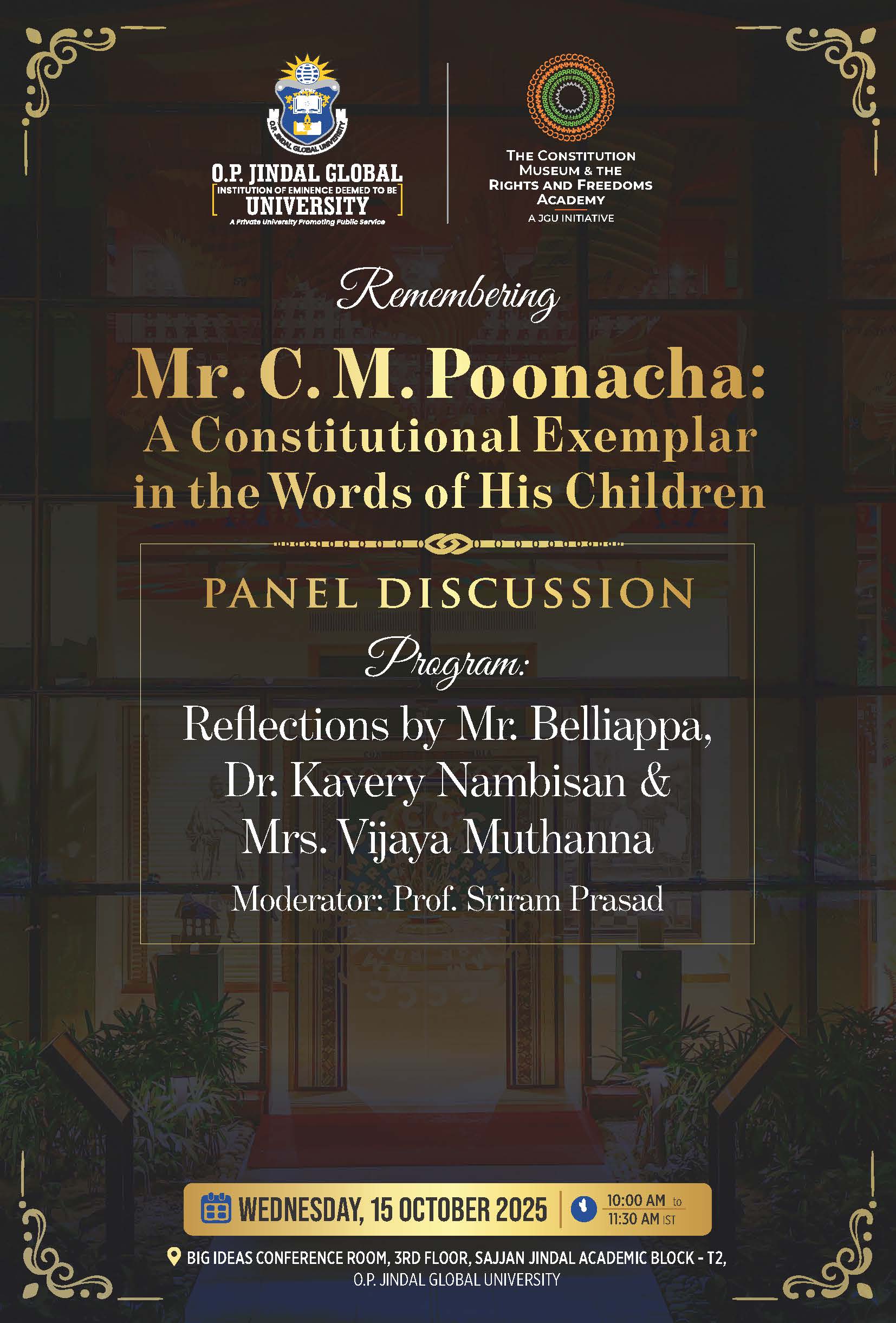 Panel discussion on, “Remembering C.M. Poonacha: A Constitutional Exemplar in the Words of His Children”, organized by the Constitution Museum and the Rights and Freedoms Academy, O.P. Jindal Global University. C.M. Poonacha was a member of the Constituent Assembly of India representing the Coorg Province. He played a significant role in the framing of the Constitution of India. He also served Independent India as the Chief Minister of Coorg, Governor of Odisha and Madhya Pradesh, and the Union Minister of Railways.
